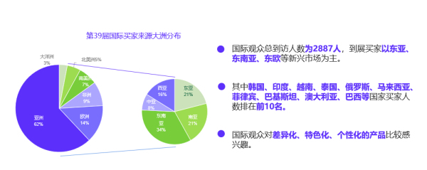 ▲佛山陶博會運營總監(jiān)陳智鵬 01 第39屆秋季佛山陶博會的總體情況 1、 第39屆秋季佛山陶博會總展覽規(guī)模50萬+平方米,總參展品牌828家,發(fā)布新品30000+款,參觀人數(shù)63056人,舉辦主題活動65場次,直播活動15場次,總直播訪問量402132人次。 2、 在客流版塊,整體呈現(xiàn)出國際客流、中國陶瓷城展館客流強勁復蘇的態(tài)勢。 3、 在國內(nèi)買家的產(chǎn)品需求方面,特色磚(防滑、耐磨、色磚、房屋、小磚、花磚等)關注度最高,其次是大板/巖板、仿古磚、瓷磚美縫/輔材、智能衛(wèi)浴等品類。 4、 在國際買家的產(chǎn)品需求方面,對差異化、特色化、個性化的產(chǎn)品比較感興趣。